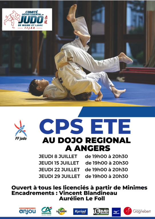CPS ETE DU JEUDI AU DOJO REGIONAL A ANGERSOuvert à tous les licenciés à partir de Minimesles jeudis 8/15/22/29 juillet de 19h00 à 20h30Encadrement : Vincent Blandineau et Aurélien Le Foll