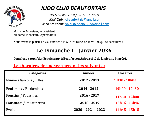 17/01/2026 - 9h: Championnat départemental cadets (pesées décalées)