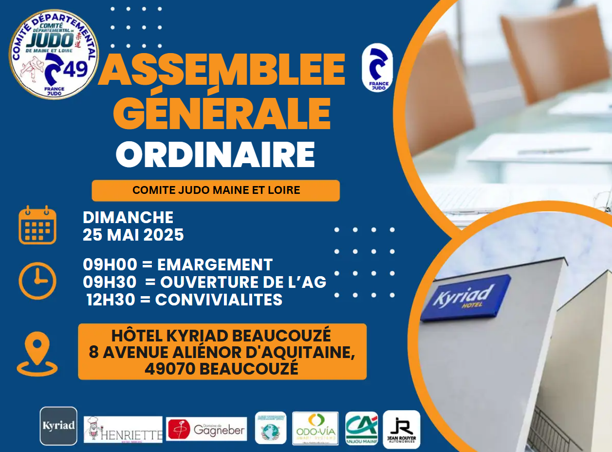 Veuillez trouver la convocation pour l'Assemblée Générale du Comité de Judo de Maine et Loire qui aura lieu le Dimanche 25 mai 2025 à l'hotel kyriad de Beaucouzé À l’ordre du jour : 9h00 : Pointage des clubs 9h30 : Ouverture de l'Assemblée Générale 12h30 : Convivialités Veuillez trouver également en lien ci-dessous : - la convocation - le procès verbal de l'AG du 5 MAI 2024 les rapports statutaires : - du Président - de la Secrétaire Générale, - du Trésorier Général - l'arrêté des comptes 2024 et budget prévisionnel 2025 révisé et 2026 les rapports des commissions - com PARA Judo - com commissaires sportifs - com ne waza - com taiso - com jujitsu - com des grades - com arbitrage - CTF - Informations fédérales - modifications règlements sportifs - info insta un modèle de pouvoir et de procuration (rappel qui vote à l'AG /répartition des voix) pour ceux qui qui n'ont pas répondu directement sur la convocation, en lien un formulaire de participation