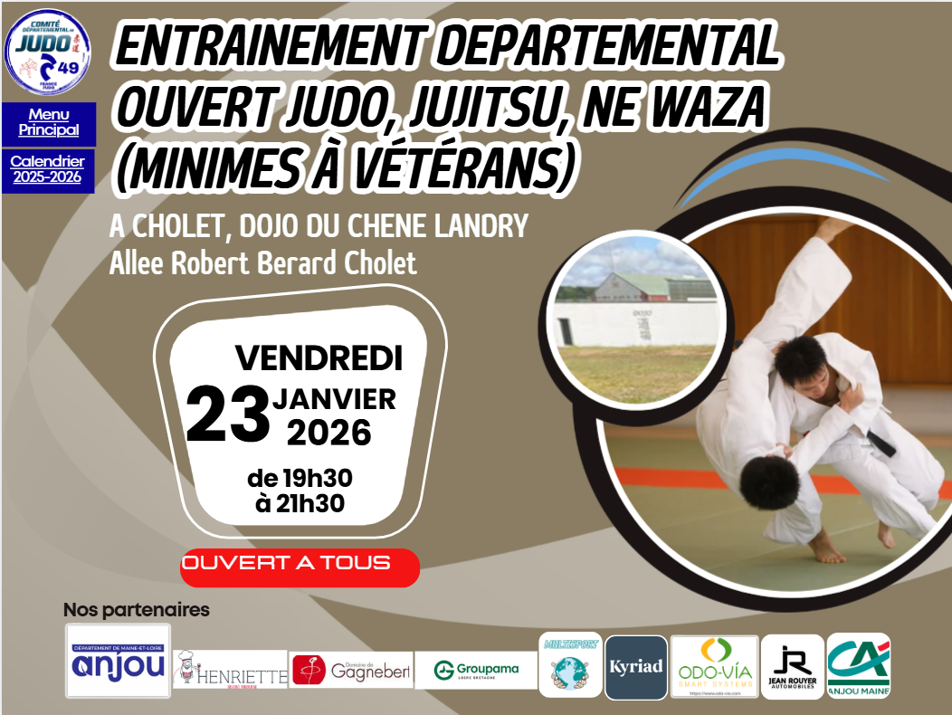 19h30-21h30: Entraînement ouvert judo, jujitsu, ne waza (minimes à vétérans) A CHOLET