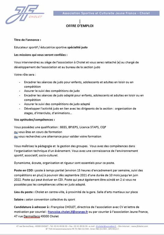 Dans le cadre de la saison 2021-2022, notre la JF Cholet est à la recherche d’un(e) professeur(e) en judo