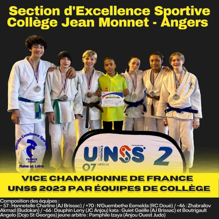 L'équipe du collège Jean Monnet d’Angers (établissement support de la section d'excellence sportive judo) vice championne de France par équipes de collège UNSS le 5 avril 2023.